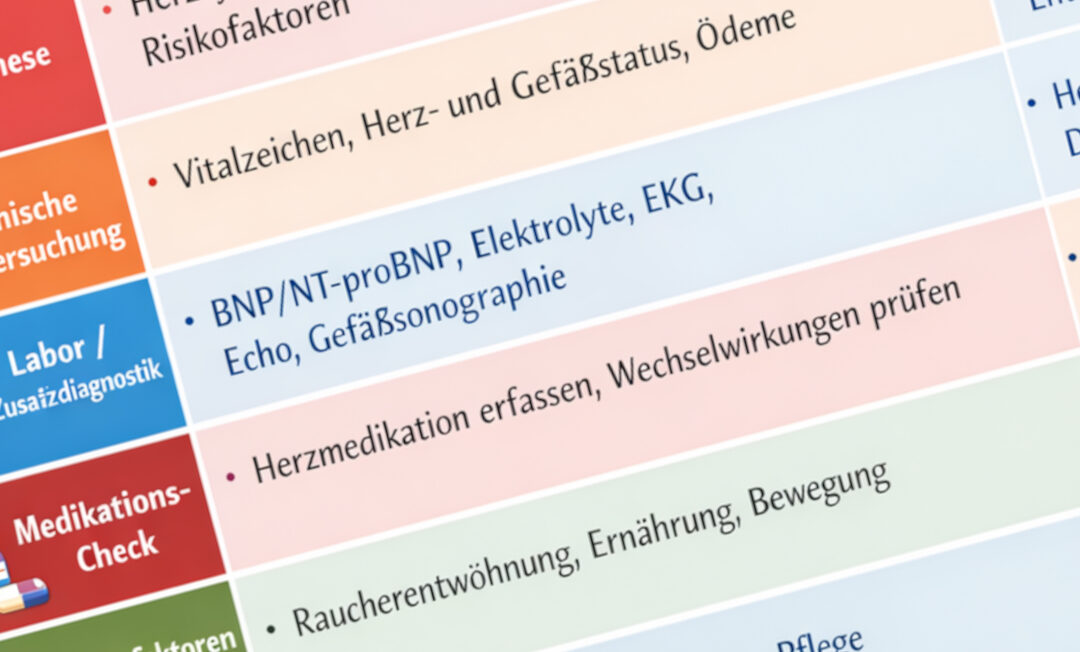| Labor / Zusatzdiagnostik | BNP/NT-proBNP, Elektrolyte, Nierenwerte, EKG, Echo, Gefäßsonographie | Erkennen von Herzleistungseinschränkungen und Durchblutungsstörungen |